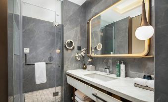Room was spacious and overlooks a pond. There is a separate shower and toilet area. Toilet bowl is automatic and can be a challenge to use as the lid sometimes closes without warning. Shower flooring is anti-slip and water temperature of the shower was easy to adjust.