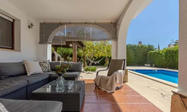 L'Ampolla: Large, cosy, comfortable villa "Alicia". 100 m from the sea, 100 m from the beach. Private: property 700 m2, park, large, beautiful garden, swimming pool angular (8 x 4 m, depth 1 - depth 80 cm, seasonal availability: 01.Mar. - 30.Oct.). Outdoor shower, patio, garden furniture, barbecue. In the house: WiFi, washing machine, tumble dryer. Parking (for 2 cars). Shop 300 m, grocery 300 km, supermarket 3 km, restaurant, bakery, bicycle rental 300 m, 10 minute walk to the centre, bus stop 11 km, railway station 1 km. Sports harbour, marina 500 m. Nearby attractions: Port Aventura 65 km, Parque natural delta del Ebro 20 km, Ports de Beceite 45 km. Please note: railway line closeby 1 km from the property. "Alicia", 5-room villa 160 m2 on 2 levels. Comfortable and cosy furnishings: living/dining room with digital TV, international TV channels, air conditioning and forced-air heating. Exit to the patio. Open kitchen (dishwasher, 4 ceramic glass hob hotplates, toaster, kettle, microwave, electric coffee machine) with bar. Bath/WC. Upper floor: 1 double bedroom with 1 french bed (160 cm, length 200 cm), bath/shower/bidet/WC. 1 double bedroom with 1 french bed (135 cm, length 190 cm). 1 double bedroom with 2 beds (90 cm, length 190 cm). 1 double bedroom with 2 beds (90 cm, length 180 cm). Bath/WC. Patio. Terrace furniture, barbecue, deck chairs, covered balcony. Panoramic view of the ocean. Facilities: washing machine, iron, hair dryer. Internet (WiFi, free). Parking (roofed). Suitable for families. Maximum 1 pet/ dog allowed. HUTTE-002324