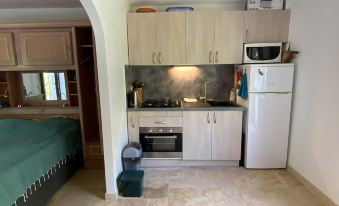 Cette location est un diamant brut dans un contexte extraordinaire : imaginez une pièce de 30m2 (séparée 50/50 chambre /cuisine) , spartiate et minimaliste, néanmoins très opérationnelle (il y a tout pour 2 personnes et tout fonctionne) dans un jardin (aucune mise en valeur) d'environ 3000m2 donnant sur la mer et à 2mns de la plage directement par un petit portillon !!! On peut regretter que l’ensemble ne soit pas plus mis en valeur, les prestations sont vraiment bas de gamme (wifi....). Le séjour est de toute facon extrêmement agréable,ballades sur le sentier du littoral,baignades...Ah l’apéritif sur l’esplanade en bois ,face a la mer !!! Magnifique,mais peut mieux faire. Excellent contact avec Johan.