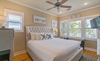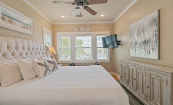 take it eeaasy is a stunning cottage-style home with three bedrooms and four baths accommodating up to ten. one step inside this luxurious, custom-built retreat and you’ll be in vacation mode. hardwood floors, natural finishes, and gorgeous furnishings welcome you into the space specifically designed for comfort and relaxation. the living area is filled with cozy furnishings and plenty of space to accommodate a crowd. calming hues and expansive windows scattered throughout the dining area add to the ambiance in this open-concept space, housing a dining table with seating for six. the kitchen features stainless steel appliances, plenty of cabinet space, and a breakfast bar with seating for four. unwind and take in coastal breezes on one of two screened porches, one off the main floor and the other off of the master suite. generous, comfortable bedrooms await at the end of the day, with king-sized beds and en suite baths in both the master and guest suites and a bunk room the kids will love with a flat-screen tv. a washer and dryer are nestled in a nook behind closed doors for added convenience.