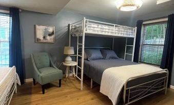In our cottage, you will find three separate bedrooms, with one bedroom upstairs and two downstairs. You will find the charming upstairs bedroom with one queen bed, to accommodate two people. Downstairs boasts two spacious bedrooms for restful nights. The second bedroom has two queen beds, as well as a loft single bed, which can accommodate up to five people. The third bedroom is also perfect for a couple or a family, with a queen bed, as well as twin bunk beds, to accommodate up to four people.