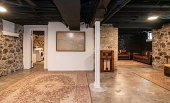 The basement is a cozy place to hang out and play a game or watch a movie. The stone walls and visible support beams provide a reminder of the history and legacy of the home.