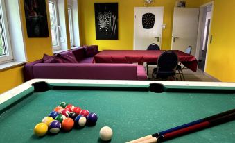The apartment offers a great location with quick access to Halle, Leipzig, Dessau and Berlin (A9/A14) – ideal for fitters, remote workers or large travel groups! The fully equipped apartment convinces with spacious space, ideal for long-term stays. The highlight: A private area with billiards and darts makes for relaxing evenings! Upon request, there is accommodation for up to 40 people in the residential building spread over several floors
