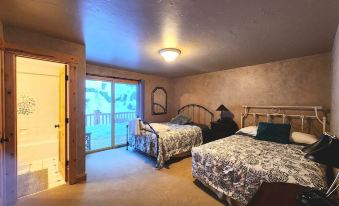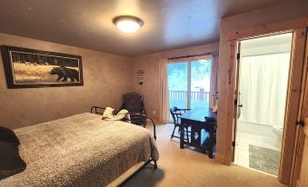The balcony off the living room gives you a full view of the meadow below, where you can watch for moose, deer, turkey and other wildlife. In addition to the indoor dining area, there is a large picnic table located here and the courtyard in the center of the house is perfect to enjoy some meals outside on those raining days.