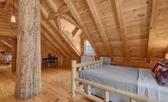 This custom-built lodge offers an immersive experience in nature, with authentic tree trunk support beams and a design that reflects the spirit of the surrounding forest.