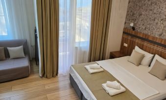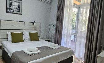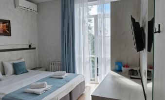 The guest house is located in one of the unique places on the Mountain Air Coast (Loo). Behind the house are the mountains, on the left side there is the forest of the Sochi National Park, and in front of the house, just 350 meters away, is the sea. The house is new, built in 2021. All suites have sea views. The room has everything you need for a comfortable stay: air conditioning, refrigerator, TV, hairdryer, bedside lamps, hangers, slippers, bathrobes. On the territory of the house there is a swimming pool with lighting and heating, a trampoline, a tennis table, sports equipment (balls, jump ropes). Gazebos, barbecue area. Guests are also offered a kitchen area for self-cooking with all kitchen utensils. The highlight of the house is the observation deck on the roof, where you can admire sunrises and sunsets. All infrastructure is within walking distance: shops, canteens, markets.