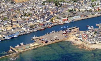 juste à côté d'une plage de rochers et d'un port bien accessibles,