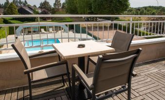 Selon le sens d'arrivée, un meilleur fléchage serait le bienvenu! Accueil cordial et professionnel. Un personnel souriant, sympa, efficace.Les chambres sont de bonnes dimensions avec une terrasse donnant sur la piscine. Un bémol, le manque de place pour ranger ses vêtements. Une salle de restaurant qui manque un peu de chaleur par une décoration trop classique. Comme un certain nombre d'hôtels/restaurants le choix des plats est vite restreint pour ceux qui restent plusieurs jours, car il n'y a pas de plat du jour qui permet éventuellement de varier.