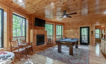 Bring the whole family or gathering of friends to this luxurious cabin....plenty room for entertaining or treat yourselves to tranquility. Our two-story cabin has 4 bedrooms, 3.5 baths, endless porches and countless amenities for your stay while visiting Natural Bridge/Red River Gorge geological area. This get-a-way has easy paved-road access as part of Cliffview Resort. After a day of hiking, enjoy relaxing in the hot-tub, a game of pool, or s'mores by a campfire.About pets:No pets allowed.About checkOut:Check out before 11:00 AM.About children:Children allowed: ages 0-17.About checkIn:Check in after 4:00 PM.About smoking:Smoking is not permitted.About minBookingAge:Minimum age to rent: 25.About events:No events allowed.