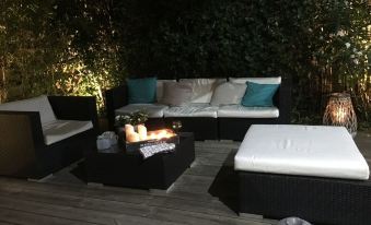 All services are top of the line including two outdoor lounges, a grill, deckchairs with cushions, an outdoor shower, Wi-Fi, bicycles, a Nespresso coffee machine, a teapot, a TV, a washing machine, a microwave, and cleaning.
