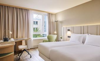 A welcoming retreat for business, exhibition, and leisure travelers, NH Leipzig Messe has medieval, German, and European history right on its doorstep. Located in the Wiederitzsch area, hotel guests can enjoy short walks to the Leipzig Trade Fair, Congress Center Leipzig, and the Leipzig Messe Bahnhof station for trams to city center sites. A short drive or S-Bahn tram ride connects visitors with Zoo Leipzig, Gewandhaus Orchestra, and Hauptbahnhof Leipzig train station and shopping mall. Historic Nikolaikirche, Völkerschlachtdenkmal, and the 15th century restaurant, Auerbach’s Kellar, are also only a short distance from the hotel. Built with the business traveler in mind, the hotel boasts a staggering 19 meeting rooms, which can accommodate gatherings of up to 320 people. The facilities provide state-of-the-art audiovisual equipment and ample hospitality options. The hotel’s 308 warmly decorated rooms include tea and coffee-making facilities, free Wi-Fi, and flatscreen TVs. Some of the rooms offer garden views. The hotel hosts an extensive breakfast buffet that will satisfy all appetites and includes hot items cooked to order. The modern NH Leipzig Messe Restaurant serves lunch and dinner with a focus on German fare. The hotel bar invites guests to relax over regional beers, wine, and cocktails.
