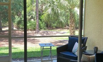 The screened lanai has comfy chairs and a bistro set. It has views out to the nature preserve and grassy lawn, where to the south you will find the community pool area, tiki huts for outdoor dining, and community BBQ grills. The pool area has a beautiful waterfall, chaise lounges for sunning, and a hot tub for soaking and enjoying the fresh Florida air and wooded preserve views that surround the complex. There is a screened room with seating for about 15 available for use in the pool area. Access to the pool area is by key.
