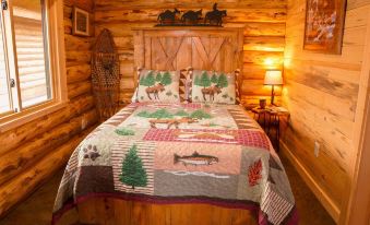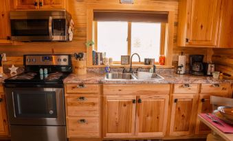 The Ranch House Cabin is a 16x24 ft. log cabin perfect for a comfortable overnight or extended stay! The Ranch House Cabin features free fiber optic Wi-Fi, streaming TV (Roku) and mini-split heat and air conditioning. It includes a full kitchen, a full-size refrigerator, stove/oven, convection microwave and large storage cabinets. USB outlets are also located throughout the cabin. The Ranch House Cabin features one queen-size bed and a brand-new Lazy Boy hide-a-bed with a full-sized mattress. This cabin is fully furnished with kitchen supplies, features an outdoor barbeque and a quiet setting.
