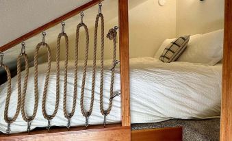 The second bedroom features a loft with a queen bed and sleeps two. The loft bedroom requires that you climb a ladder to get into bed and is not suitable for young children or individuals who may have trouble getting up and down the ladder.