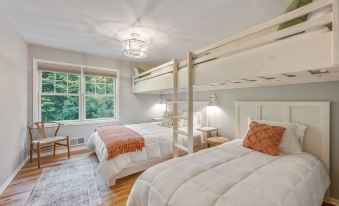 The house sleeps up to 12 guests, 9 adults comfortably plus kids. It includes 4 bedrooms and 3 full bathrooms. It includes two King Master bedrooms. There is a spacious master bedroom located on the first floor with a King Bed and a patio door leading to the deck. The main level full bathroom sits just outside the door. Located on the second floor is the 2nd master bedroom with a King Bed, walk in closet, and attached full bathroom. Also located on the second floor is the 3rd full bathroom, 3rd bedroom with a Queen bed, and the 4th bedroom featuring custom made bunk beds including a Queen Bed, and three Twin Beds. All four bedrooms include blackout blinds, brand new hybrid mattresses, and 100% cotton sateen luxury sheets. Full length mirrors in both master bedrooms as well.