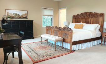 Upstairs, picture yourself relaxing in the luxurious master suite complete with a hand-carved bedframe from India, smart tv, desk, dresser, and ample closet space. The spa-like bathroom has marble floors, dual sinks, a deep jetted tub, separate shower, and water closet. Another large bedroom offers a trundle bed, walk-in closet, height adjustable desk (suitable for kids and adults), dresser, smart tv, and toys to keep your little ones entertained.