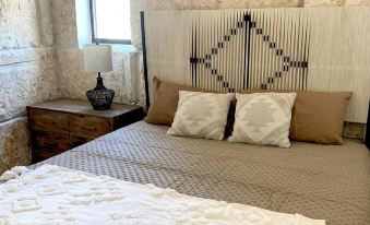 The Rock Stack is built from giant two-foot thick limestone rocks which make it a truly unique and fun place to stay. The house is roughly 1600 SF and has three bedrooms, three bathrooms, and two large outdoor patios. Two bedrooms are downstairs with king-size beds and ensuite bathrooms (one bathroom opens up into the bedroom and hallway).