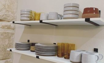 The kitchen is also downstairs. It features full-size appliances (electric oven range, microwave, dishwasher, refrigerator with water dispenser, and freezer with ice maker) as well as beautiful concrete countertops and custom-made cabinetry. We offer a fully-stocked kitchen with all pots, pans, and tools needed to fix meals.