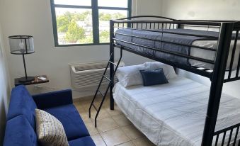 When you enter the apartment an open, bright and spacious area awaits you. The fully equipped kitchen was recently remodeled. The stool bars at kitchen countertop and dining table that sits 6 is perfect for morning breakfast in preparation for your Puerto Rico adventures. The apartment has 3 bedrooms with Air conditioner and two bathrooms at main apartment level. 2 of the bedrooms have Queen beds with comfortable mattresses. The third room is perfect for the younger ones with a bunk bed and sofa bed.