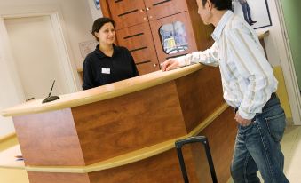 Stayed at this hotel as an overnight stop when travelling to Italy. Panicked when I saw check in closed at 9pm but as long as you have paid upfront you can check in on a computer there and are given a PIN code for your room. Room is what you expect, simple but clean.