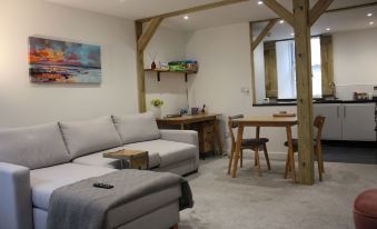 You enter the apartment into an open plan living space with a large corner sofa in the main living area leading onto a dining and study area. The kitchen extends to the back of the property with a side entrance out onto the lane. The kitchen has a double fridge freezer, washing machine and dishwasher (with a clothes horse stored behind the sofa). For cooking there are gas hobs, double electric oven with grill, microwave and kettle.