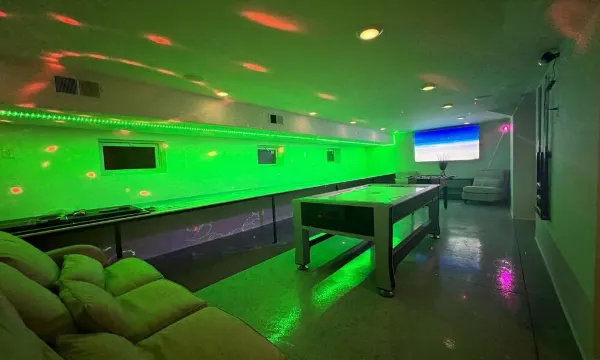 This is a Very Spacious Home with 5 bedrooms, 3 full baths, one half-bath, and an oversized outside shower with changing area. Full kitchen with everything needed for cooking and feeding your entire party. There is a 2nd kitchen and refrigerator downstairs in the entertainment rooms which showcase a pool table, air-hockey, ping-pong and foosball game tables. There are 6 large screen Smart TV’s through-out the house with super-fast internet and blue-tooth ceiling SURROUND in the Entertainment level. Parking in driveway for 6 cars, ample street parking if needed.