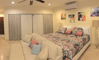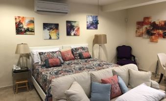 This large studio bedroom (named "Moderna") and bathroom (>400 sqft) is a lock-off apartment with external access located within the luxurious Buttermoon Villa. (> 4 400sqft) The studio has a smart TV, Wi-Fi, private external access separate from the villa. It has a full bathroom with combination soaker tub/shower. The kitchenette area has a microwave, mini refrigerator and coffee pot. Fully air-conditioned. Configuration is either a large King Bed or 2 XL single beds. Room includes dining table for two and comfortable couch/ottoman for lounging. This property is located at the Cupecoy beach (no access to the private pool or the villa amenities)