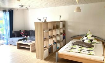 We have plenty of books, children's books and various games and toys in the living room with a cozy living area. You will also find a TV and stereo system, a work station and a 1.50 x 2.00 m double bed with wardrobe.