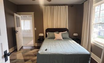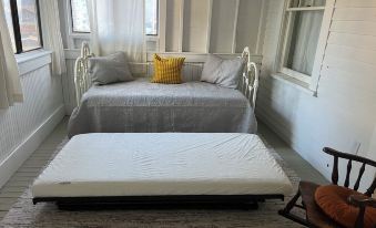 Bedroom 2: Queen hybrid bed, with direct access to an uninsulated sunroom featuring a twin daybed and twin trundle—great for kids or extra guests (note: the sunroom can get chilly in winter or warm in summer).