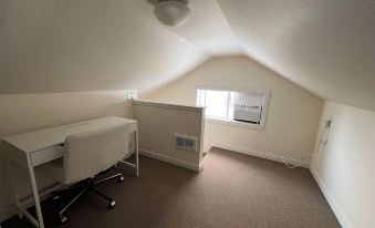* Dedicated office space in the upstairs loft with sloped ceilings (~5'6" max height), a window A/C unit, and a cadet wall heater—ideal for remote work or study