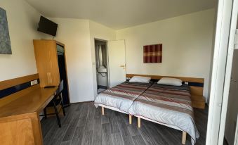 Petit blocs de bâtiments défraîchis et mal entretenus. Tâches sur la couette, porte de salle de bain degondée, impossibilité d’ouvrir la fenêtre. La poignée est cassée, traces de calcaire dans la cuvette de WC, dévidoir, mouchoirs papier vide, vitre porte d’entrée fêlée. Malgré la proximité de la route et de la zone industrielle, l’hôtel est au calme. Je n’ai pas payé à prix élevé mais ça ne vaut pas plus.