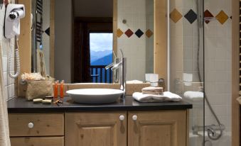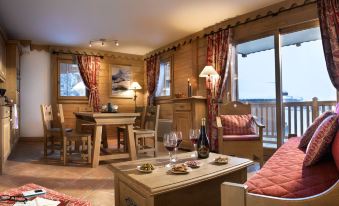 Beautiful, rustic, comfortable residence "CGH Rés & Spa Les Granges du Soleil". 5 houses in the residence. 83 apartments in the residence. In the district of Plagne Soleil 1.5 km from the centre of La Plagne, 20 km from the centre of Aime, 35 km from the centre of Moutiers, in a sunny position, directly by the skiing area. For shared use: indoor pool heated (12 x 6 m, seasonal availability: 01.Jan. - 31.Dec.). In the complex: reception, lounge, WiFi, sauna, fitness room, massage (extra). Steam room, hot tub, billiard table, lift, storage room for skis, washing machine (extra), ski boot dryer. Bread roll service. Storeroom available. Stepped path to the house. Communal covered parking (extra) at the house, public parking 400 m. Parking space or garage only for small to medium-sized cars. Dimension: height 200 cm. Shop, grocery, restaurant 100 m, railway station "Aime - La Plagne" 20 km. Walking paths from the house, chair lift, slopes 50 m, ski rental. Well-known ski regions can easily be reached: Paradiski. Please note: baby equipment on request (included). In case of good snow conditions, the house is accessible on skis. Loading and unloading of baggage is possible at the holiday house. The photograph shows a typical example. The holiday properties may differ in living space, floorplan, equipment and furnishing. "CGH Rés&SpaLes Granges du Soleil", 4-room apartment 75 to 90 m2. Object suitable for 8 adults. Tasteful and wooden furniture furnishings: living/sleeping room with 2 sofabeds, 2 pull-out beds, dining table and satellite TV. Exit to the balcony. 1 room with 1 french bed. 2 rooms, each room with 2 beds. Kitchenette (oven, dishwasher, 4 ceramic glass hob hotplates, toaster, kettle, electric coffee machine, steamer). Bathroom, shower, 2 sep. WC's. Heating. Balcony. Balcony furniture. Facilities: telephone, hair dryer. Internet (WiFi, free). Please note: non-smokers only. Maximum 1 pet/ dog allowed. Smoke alarm, fire extinguisher. This type of apartment can also be created on two levels.