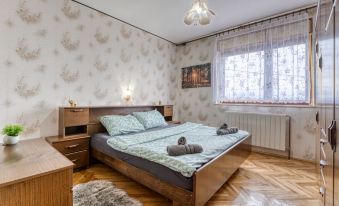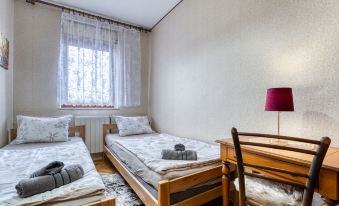 2-family house "Maklen". 1.5 km from the centre of Brod Moravice, in a sunny, elevated position, 70 km from the sea, in the countryside. For shared use: property 1'100 m2 with lawn and plants. Badminton, barbecue house (slide, swing). In the house: internet access, hot tub (extra). Billiard table, central heating system. Parking at the house on the premises. Shop 1.6 km, supermarket 26 km, restaurant 20 km, bus stop 3 km. Nearby attractions: NP Risnjak 40 km, Zeleni vir 16 km, Kamačnik 20 km. Please note: suitable for families. The owner does not accept any youth groups. It is necessary to announce the heating of the hot tub in advance. 3-room apartment 100 m2 on 1st floor. Living/dining room with cable TV. Exit to the balcony. 1 room with 1 double bed (2 x 90 cm, length 190 cm). 1 room with 2 beds (90 cm, length 200 cm). Open kitchen (2 hot plates, oven, toaster, kettle, microwave, freezer, electric coffee machine). Bath/WC. Heating. Balcony 12 m2. Balcony furniture. View of the forest. Facilities: Internet (WiFi, free). Parking (1 car). Please note: non-smoking house.