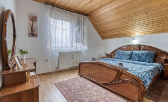 2-family house "Maklen". 1.5 km from the centre of Brod Moravice, in a sunny, elevated position, 70 km from the sea, in the countryside. For shared use: property 1'100 m2 with lawn and plants. Badminton, barbecue house (slide, swing). In the house: internet access, hot tub (extra). Billiard table, central heating system. Parking at the house on the premises. Shop 1.6 km, supermarket 26 km, restaurant 20 km, bus stop 3 km. Nearby attractions: NP Risnjak 40 km, Zeleni vir 16 km, Kamačnik 20 km. Please note: suitable for families. The owner does not accept any youth groups. It is necessary to announce the heating of the hot tub in advance. 3-room apartment 100 m2, on the top floor. Living/dining room with sloping ceilings, ceiling height 140 - 270 cm with cable TV. Exit to the balcony. 1 room with sloping ceilings, ceiling height 140 - 270 cm with 1 double bed (2 x 90 cm, length 200 cm). 1 room with sloping ceilings, ceiling height 140 - 270 cm with 2 beds (90 cm, length 200 cm). Open kitchen (2 hot plates, oven, dishwasher, kettle, freezer, electric coffee machine). Shower/WC. Heating. Balcony 12 m2. Balcony furniture. View of the forest. Facilities: Internet (WiFi, free). Parking (2 cars). Please note: non-smoking house.