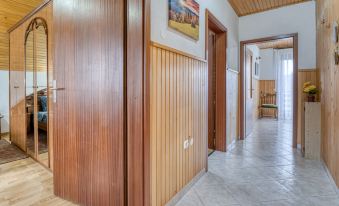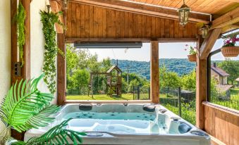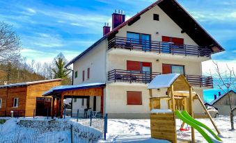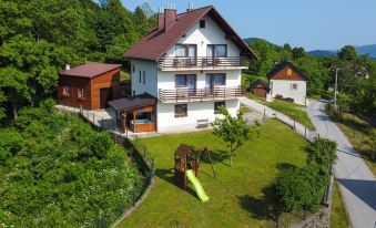 2-family house "Maklen", 2 storeys. 1.5 km from the centre of Brod Moravice, in a sunny, elevated position, 70 km from the sea, in the countryside. Private: property 1'100 m2 with lawn. Badminton, barbecue house (slide, swing). In the house: internet access, hot tub (extra). Billiard table, central heating system. Parking (for 3 cars) at the house on the premises. Shop 1.6 km, supermarket 26 km, restaurant 20 km, bus stop 3 km. Nearby attractions: NP Risnjak 40 km, Zeleni vir 16 km, Kamačnik 20 km. Please note: suitable for families. The owner does not accept any youth groups. Part of the house is closed and unoccupied. It is necessary to announce the heating of the hot tub in advance. 6-room house 200 m2 on 2 levels. Living/dining room with cable TV. Exit to the balcony. 1 room with 1 double bed (2 x 90 cm, length 190 cm). 1 room with 2 beds (90 cm, length 200 cm). Open kitchen (2 hot plates, oven, toaster, kettle, microwave, freezer, electric coffee machine). Bath/WC. Heating. Top floor: living/dining room with sloping ceilings, ceiling height 140 - 270 cm with cable TV. Exit to the balcony. 1 room, ceiling height 140 - 270 cm with 1 double bed (2 x 90 cm, length 200 cm). With sloping ceilings, ceiling height 140 - 270 cm with 2 beds (90 cm, length 200 cm). Open kitchen (2 hot plates, oven, dishwasher, kettle, freezer, electric coffee machine). Shower/WC. 2 balconies 12 m2. Balcony furniture, deck chairs (8). View of the forest. Facilities: Internet (WiFi, free). Please note: non-smoking house.