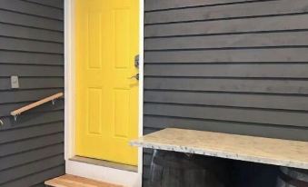 The bright yellow door will welcome guests as they pull into the private entrance off the carport. The wide, hardwood staircase guide you up to the open studio. Continued hardwoods throughout lead you to the gorgeous kitchen area with lovely and peaceful green, soft close cabinetry with a beautiful cream colored quartz counter top, spacious refrigerator, full size dishwasher, built-in microwave, deep stainless steel kitchen sink and hidden stack-able washer and dryer rounds out the kitchen area. Please note, no oven, but we do provide a microwave, hot plate, toaster oven, instant hot water kettle, and slow cooker for those looking to cook meal.