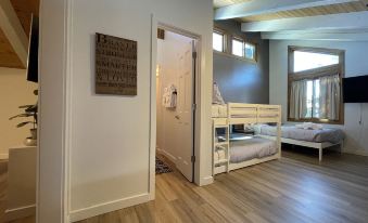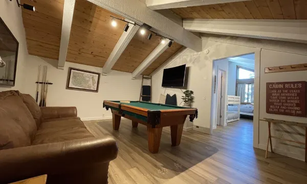 Newly Remodeled Spacious 1500 square foot condo. 2 bedrooms with King beds + loft sleeping area with 3 full size beds+ game room. Soaring 20-foot ceilings welcome you to an open living room + dining + kitchen. All new furnishings, paint and carpet invite to relax and enjoy the view. The condo is complete with everything you need to unwind. Including high speed Wi-Fi. A fully stocked kitchen, extra towels, washer and dryer plus very family friendly. Tucked in the closets and den you will find a wooden portal crib with extra sheets and pad, high chair, baby gate and a bucket of toys. The ground floor features a spacious master bedroom with king bed with attached bathroom. The Master bedroom enjoys a smart TV as well as a cable box. The 2nd bedroom with king bed with nearby second bathroom is also located on the main floor. Every room of the home enjoys new flat screen smart TV’s with Netflix. The large flat screen over the fireplace in the living has a smart TV but also has a cable box. Upstairs in the loft, guests, will have the choice of 3 full beds. 1 set of bunk beds plus another full bed and the third bathroom. In the adjacent den find comfortable leather couches , pool table, board games, cards, puzzles and a folding table for card games. This condo complex has some of the best maintained grounds in all of Mammoth. A beautiful pool with a view of the Sherwins , 2 deep soaking hot tubs and saunas. The grounds offer paved walking paths, outdoor communal BBQ’s and above all space to enjoy to view and sound of the creek.