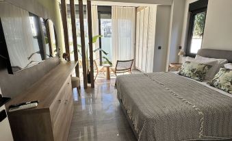 The spacious living room opens directly to the garden, offering a peaceful space where you can enjoy the outdoors, whether it’s for a morning coffee or an evening barbecue.