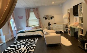 Enchanting art-filled home less than 2 miles from the most gorgeous beach: Singing Beach. Pink sparkly living room, whimsical decor, sliding glass doors from two bedrooms and living room onto large covered deck with twinkle lights. Full bright open kitchen. Pink laundry room. Pristine home with central air conditioning. Three televisions with Apple TV/streaming. Fire pit and one acre of woods in backyard. Walk to shops, restaurants, library. Bike to beach. 5 minutes to Black &White beach, 10 minutes to Hammond Castle, 15 minutes to the beaches of Gloucester and Ipswich, and a 30 minute train ride to Boston. 5 bedrooms 3 baths. About pets:No pets allowed.About checkOut:Check out before 11:00 AM.About children:Children allowed: ages 0-17.We love children!.About checkIn:Check in after 4:00 PM.About smoking:Smoking is not permitted.About minBookingAge:Minimum age to rent: 30.About events:Events allowed: birthday parties.Maximum event attendees: 15.