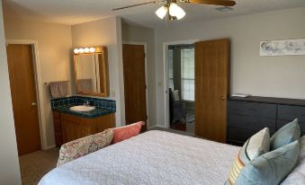 This property borders the beautiful Gage Gardens. The master bedroom is downstairs with a private bathroom, whirlpool tub and a large walk in closet. This property has a beautiful living area open to a full kitchen, fully stocked, with granite countertops, and a full laundry room with a washer and dryer. Upstairs there are two bedrooms with a jack and jill bathroom, and a sitting area. Outside the back door you will find an outside sitting area with a propane grill. The front door opens up to a beautiful pool and hot tub, shared with the main house(The Grand Oasis). This property is within walking distance to the main strip where you will find plenty of small shops, the V-6 coffee shop, The Brick Vault(our town’s barbecue and brewery), art shops and The Historic Gage Hotel and Restaurant. Big Bend National Park is less than an hour away. The unique town and National Park offers activities for the whole family.About pets:No pets allowed.About checkOut:Check out before 11:00 AM.About children:Children allowed: ages 0-17.About checkIn:Check in after 3:00 PM.About smoking:Smoking is not permitted.About minBookingAge:Minimum age to rent: 25.About events:No events allowed.