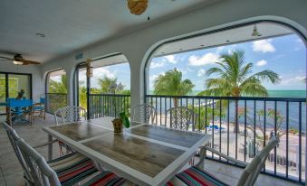 After a light breakfast on the balcony, (also seats eight easily) take your morning coffee and stroll through the young orchard full of exotic tropical fruit trees aFour ample bedrooms, each with a tv, two with king beds and ocean views, one with a queen bed, the fourth, with two extra long twin beds and large windows overlooking the tropical gardens. Three full bathrooms are finished with travertine stone or tile. This home sleeps eight easily. And of course, there's a new front load laundry in the hallway.nd plants like dragon fruit, sapodilla, avocado and carambola. Or, take your stroll down the 285 foot peer, a great time to spot sealife. Catch some sun on the beach, dip into the warm Gulf waters for a refreshing swim, or explore the marine life from the dock with mask and snorkel. Use the private boat ramp to launch your medium/small boat or jet skis during high tide, or use the uncluded kayaks or paddle boards for a little exercise. Boating and fishing enthusiasts will love the addition of the long dock with dolphin piles for safe mooring.
