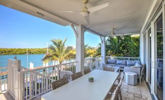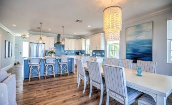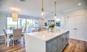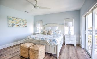 The Coral Cove is a newly constructed spectacular home in the secure, gated community in The Tides at Vaca Cut. This designer decorated coastal beauty is situated right on the waterway with quick direct access to both the Atlantic Ocean and the Gulf of Mexico. Enjoy the bay breeze from the open air balconies, all while watching the boats pass by and the pelicans and manatees visit the area. Relax in the private pool and hot tub and dine al fresco as the sun sets. With plenty of space for 12 guests, this 2293 square foot home has all the amenities you could want. The spacious master bedroom has a king bed, an en suite bath with a huge walk-in closet and a private balcony. There is also a junior master suite with a king bed, en suite bath and a cozy sitting area. There are two more bedrooms with queen beds and one room with bunk beds, and a trundle to comfortably sleep 3 children. Each of the 5 bedrooms have wall mounted flat-screen smart TV's for all of your television streaming.