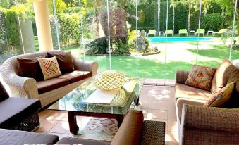 The villa is located in an upscale residential area with lots of green areas. The community gardens can be used and the community pool only from July to August and is regulated by the Community of the Urbanisation, so its use and rules are independent from the villa and without any liability from our part. The common areas include 2 paddle courts and a spacious landscaped playground.