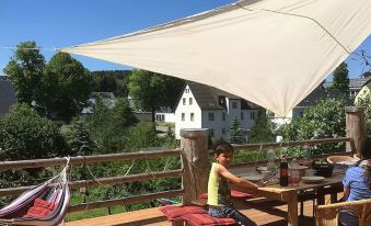 From the kitchen, large glass doors open directly onto the expansive terrace: a dream loft apartment for all four seasons – 60 m² for two to four guests, with wide glass doors connecting seamlessly to the terrace. Fully equipped kitchen, bathroom, TV, Wi-Fi, generous garden with barbecue and fire pit, shared terrace, shopping options within 150 m, sauna, fitness room, trampoline, vegetable garden with fresh salads, tomatoes, beans, strawberries and herbs – plus a small pool (available in spring, summer and autumn). And yes, you can collect fresh organic eggs straight from the chicken coop.