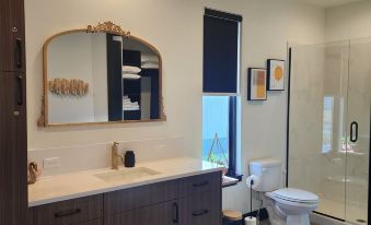 Enjoyed our stay! Decorated beautifully, love the extra tall doors & shower. Bed was comfy. Owner left snacks. It was quiet other than the occasional train and some highway noise. No complaints. Only thing to critique would be the lighting above the bathroom sink is dim when putting on makeup. We will certainly stay there again & highly recommend. Thank you!!