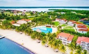The resort is absolute beachfront with a gorgeous white sandy beach leading into the Caribbean. It is located on a calm, shallow bay perfect for swimming, snorkeling, and kayaking. It has the largest swimming pool in Belize, complete with a swim up tiki bar! It also offers excellent restaurants, including fine dining over the water, and many other nearby options.