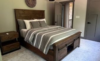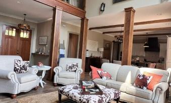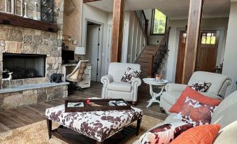 Living Area: The living room features high ceilings, rustic wooden beams, and a cozy fireplace. The perfect spot to curl up with a book or enjoy a movie night. Our fully furnished covered patio with a fireplace offers a comfortable outdoor living space, perfect for relaxing and soaking in the stunning natural surroundings