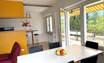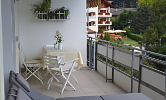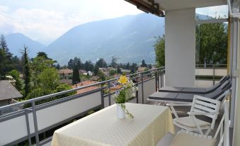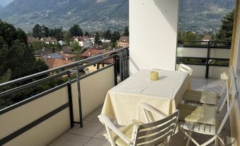 This eqquisite holiday apartment, designed with clean lines und shapes, offers the perfect retreat for discerning travelers seeking peace and comfort. The tastefully furnished rooms invite guests to enjoy longer stays. Especially during the quiet winter and spring monts, this apartment becomes a place of coziness. While the clear winter air or the first spring flowers beckon outside, you can enjoy the mild winter sun on the wind-protected terrace, away from prying eyes, or the soothing warmth in the sun-drenched rooms with magnificent views of the surrounding mountains. The apartment is also an ideal starting poit for those who value sustainability and prefer to travel by train. It's just a few minutes' walk from good transport links and centally located between the city center, the Brunnenplatz with various shops, bars, and restaurants, the enchanting gardens of Trauttmansorff Castle, and the hiking and ski paradise Meran 2000. If you enjouy cooking, it will be a breeze in the fully equipped kitchen. Everything is available, form the four-burner glass-ceramic stove to the coffee machine, to prepare a delightful breakfast, lunch, or dinner in the dining area of the living room or on the large south-facing balcony. Modern and smple design is also reflected in the bathroom and the two bedrooms.