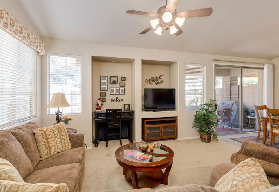 Inviting location! Well-appointed, deluxe townhouse with Mesa golf course view. Two master bedrooms, 2.5 baths located in a highly desirable NE Mesa gated community with a heated pool and hot tub. Comfortable home is an ideal haven for couples seeking a relaxing, convenient location. Minutes from several public golf courses, shopping, restaurants and recreation.About pets:Pets allowed: dogs (limit 2 total).Additional cleaning charge for more than two pets..About checkOut:Check out before 11:00 AM.About children:Adults only.About customRules:No smoking indoor or in patio. (Each building has three or four attached units.).We love doggos, but we do extra cleaning if more than two doggos visit (small up-charge). (Many of our guests have allergy-related issues.).About checkIn:Check in after 3:00 PM.About smoking:Smoking is not permitted.About minBookingAge:Minimum age to rent: 25.About events:No events allowed.