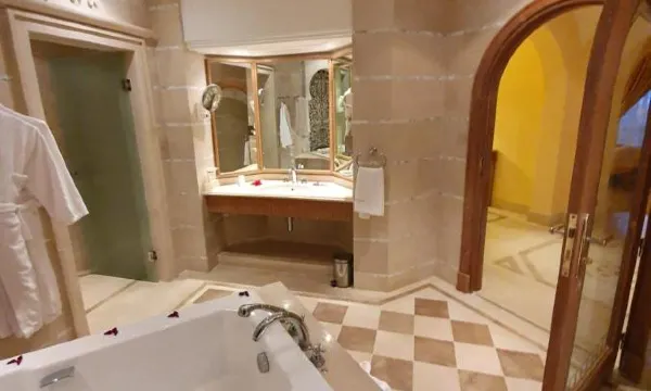 Positive aspects Very nice hotel from the outside, the magnificent lobby is very impressive but there is no value for money Room designed in the 70s with. Salty desalinated water!!! There is no hook in the shower for robes Sink knobs with hot written in French and cold written in English!! Fixed shower that doesn't move and you can't adjust the flow of water!